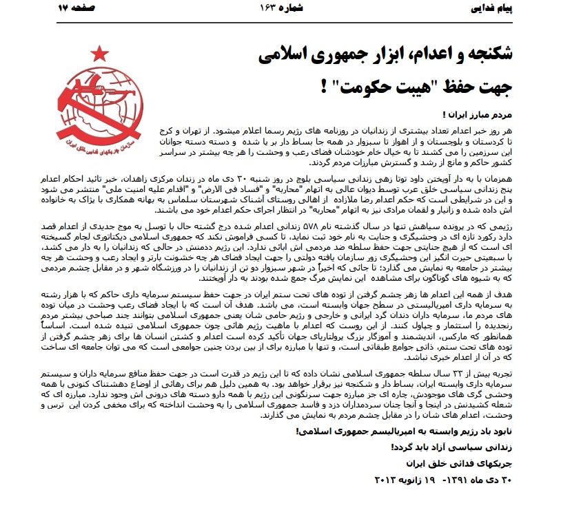 تجربه بیش از ۳۳ سال سلطه جمهوری اسلامی نشان داده که تا این رژیم در قدرت است در جهت حفظ منافع سرمایه داران و سیستم سرمایه داری وابسته ایران، بساط دار و شکنجه نیز برقرار خواهد بود. به همین دلیل هم برای رهائی از اوضاع دهشتناک کنونی با همه وحشی گری های موجودش، چاره ای جز مبارزه جهت سرنگونی این رژیم با همه دارو دسته های درونی اش وجود ندارد. مبارزه ای که شعله کشیدنش در اینجا و آنجا چنان سردمداران دزد و فاسد جمهوری اسلامی را به وحشت انداخته که برای مخفی کردن این ترس و وحشت، اعدام های شان را در مقابل چشم مردم به نمایش می گذارند.