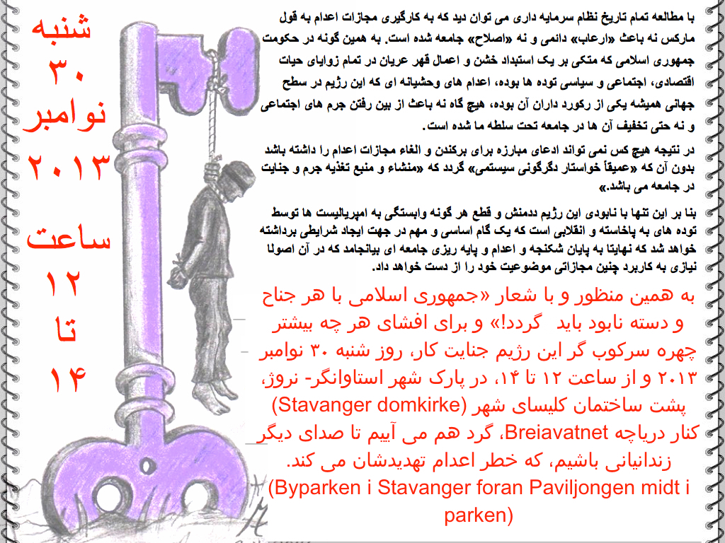 به همین منظور و با شعار «جمهوری اسلامی با هر جناح و دسته نابود باید گردد!» و برای افشای هر چه بیشتر چهره سرکوب گر این رژیم جنایت کار، روز شنبه ۳۰ نوامبر ۲۰۱۳ و از ساعت ۱۲ تا ۱۴، در مرکز شهر استاوانگر- نروژ، پشت ساختمان کلیسای شهر (Stavanger domkirke) کنار دریاچه Breiavatnet به آدرس (Byparken i Stavanger foran Paviljongen midt i parken) گرد هم می آییم تا صدای دیگر زندانیانی باشیم، که خطر اعدام تهدیدشان می کند.