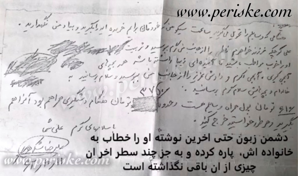 بریدگی …………………………………………………………………………………………. هنگامی که وسایلم را تحویل میگیرید ساعت سیکو من که خودتان برایم خریدهاید را بگیرید و به یاد من نگه دارید. علی کوچکه فرزند خواهرم … را از جانب من گرم ببوسید و تربیت ……………………………………………………………………………………. او را خوب مواظب باشید تا آیندهای زیبا داشته باشد. همه بچههای آبجی کبرا و آبجی اکرم، آبجی فاطی و داداش عزیز را از جانب من ببوسید و سلام برسانید. به خالهام و بچههایش سلام گرم برسانید.